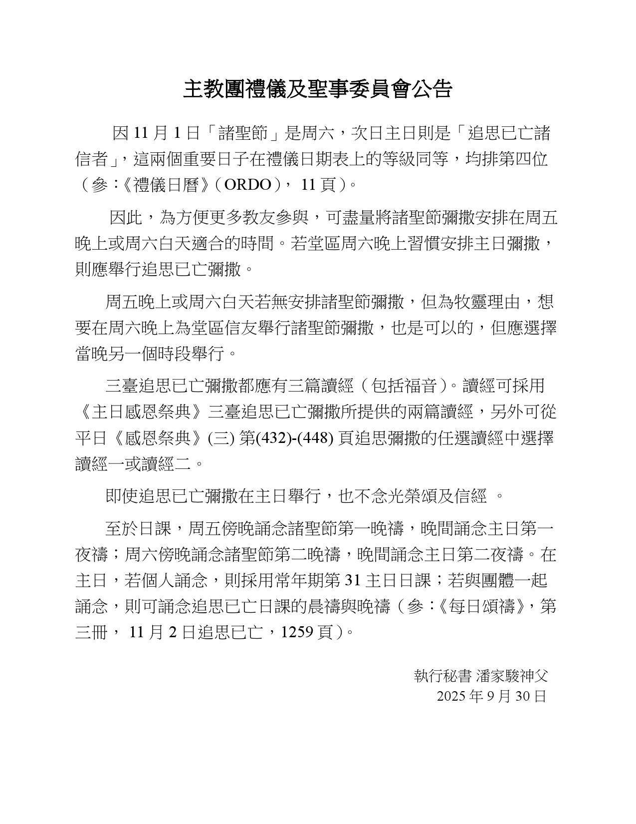 主教團禮儀及聖事委員會公告: 2025年諸聖節及追思已亡