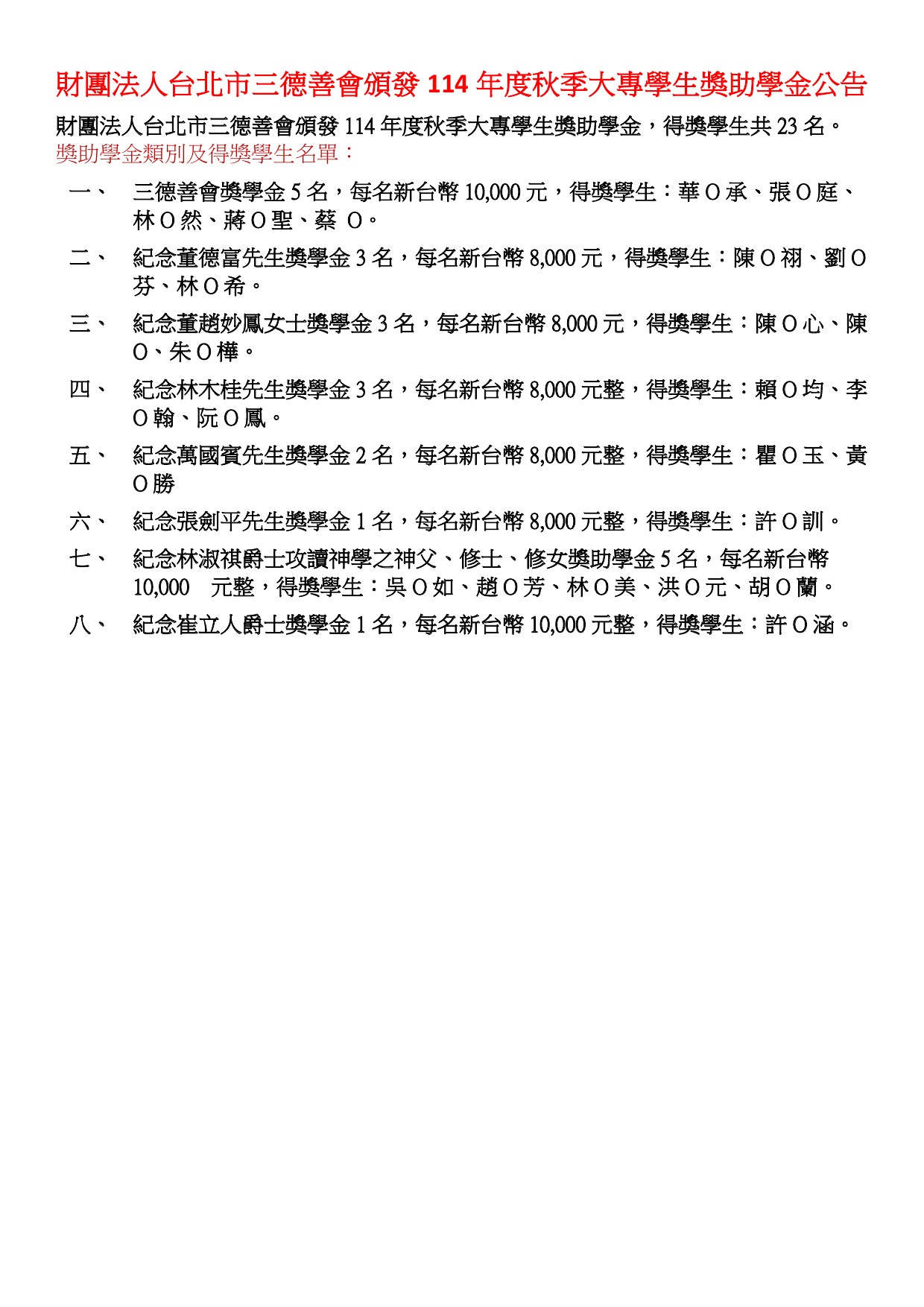 三德善會~~頒發114年秋季大專學生獎助學金公告 2025-11-07